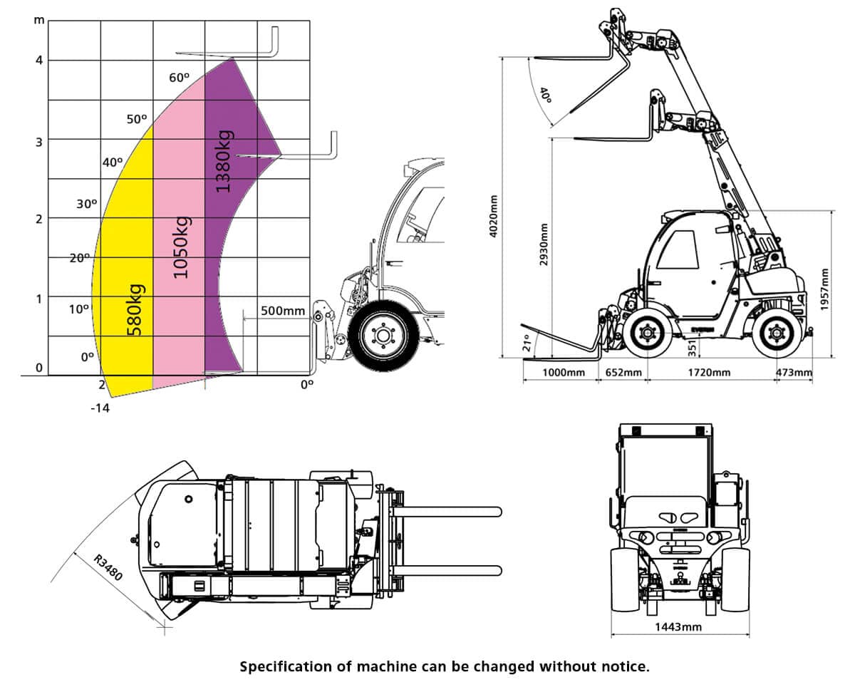 Lifting Capacity is 1,350 kilograms up to height of 4.0 metres (boom retracted).