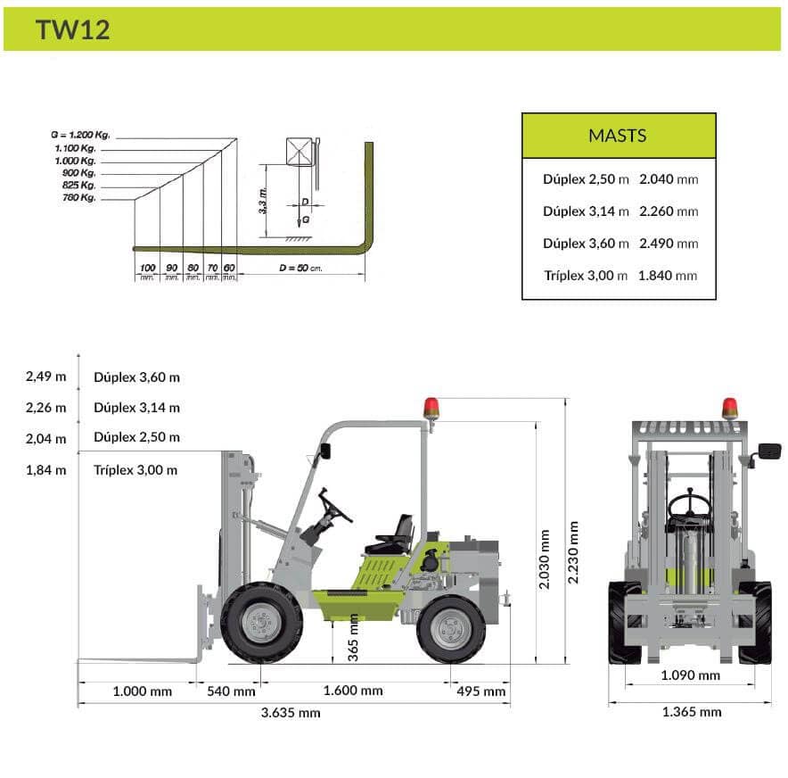The TW12 is driven by a three-cylinder and 19 KW Kubota engine that generates 25 horsepower. It lifts 1,200 kilograms up to height of 3.6 metres. It has a considerable capacity despite being a small machine. It is easy to operate and moves fast: with a top speed of eighteen kilometres per hour and is capable of navigating slopes of up to 35%.