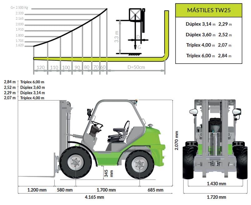 The TW30 and The TW35 forklift is a model with 4×4 in-wheel motor technology that reaches 24 km/h and lifts loads of 3,000 kg to 3,500kg at six metres high.